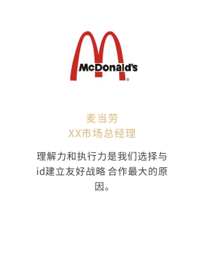i-d先后經(jīng)歷與Audi、Mercedes-Benz、infiniti、PORSCHE、可口可樂、麥當(dāng)勞、肯德基、Budweiser、華為、小米、中國移動(dòng)、ELLE、L'OREAL、萬達(dá)、仁恒置地、恒大、碧桂園、蘭桂坊...的業(yè)務(wù)合作,成功地將國際化的營銷策劃理念及執(zhí)行方式融入本土,為更多的中國企業(yè)開啟全新的品牌推廣思路和執(zhí)行方案。